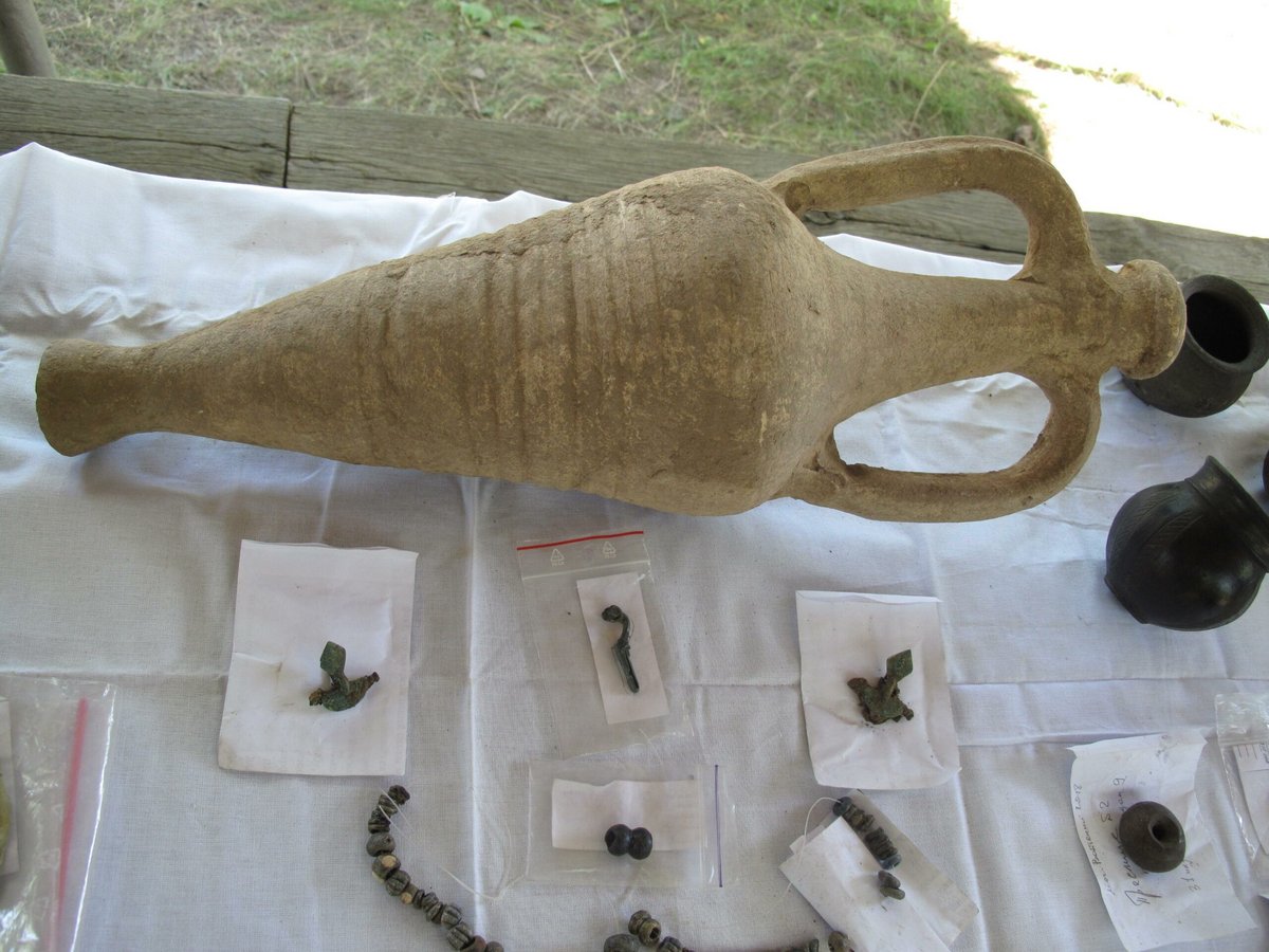 Funde aus Gräbern: Fibeln, Glasperlen, Tonspinnwirtel, einheimische Keramikbecher und eine römische Amphora © Germanisch-slawische archäologische Expedition Charkiw// UAH Admin
