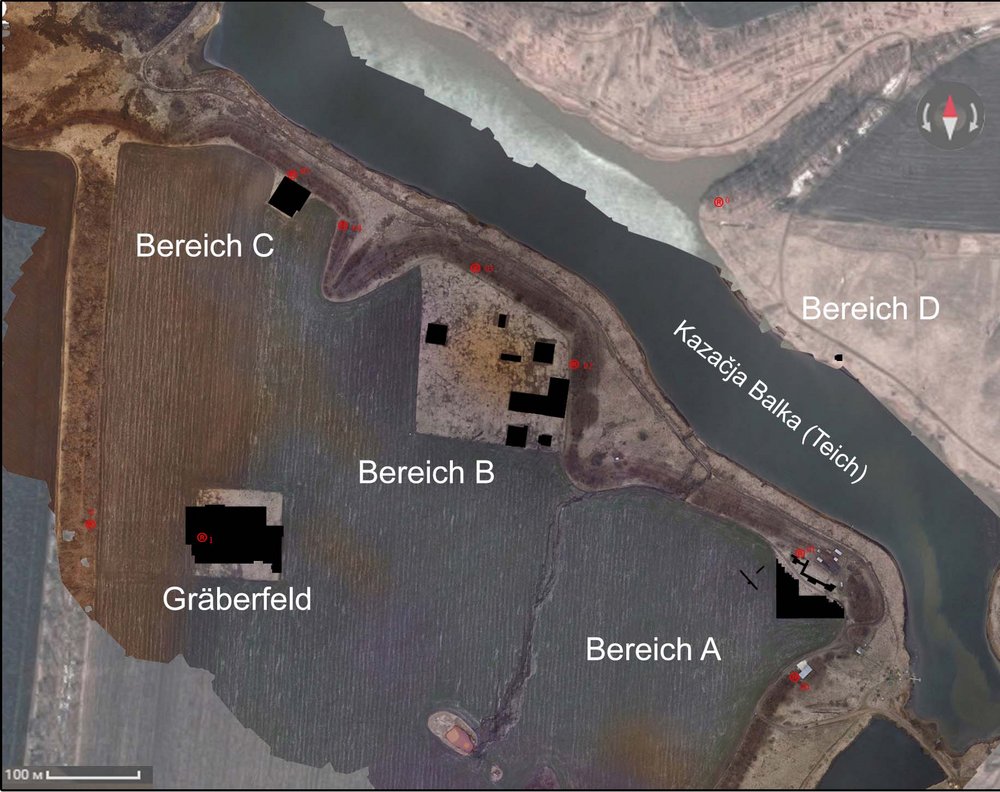 Blick auf die Bereiche der Siedlung und den Bestattungsplatz in Vojtenki, schwarz markiert die bisher ausgegrabenen Flächen