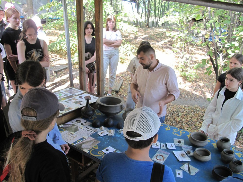 Vasilij Rusnak zeigt einer Jugendgruppe Funde aus Vojtenki © Germanisch-slawische archäologische Expedition Charkiw// UAH Admin