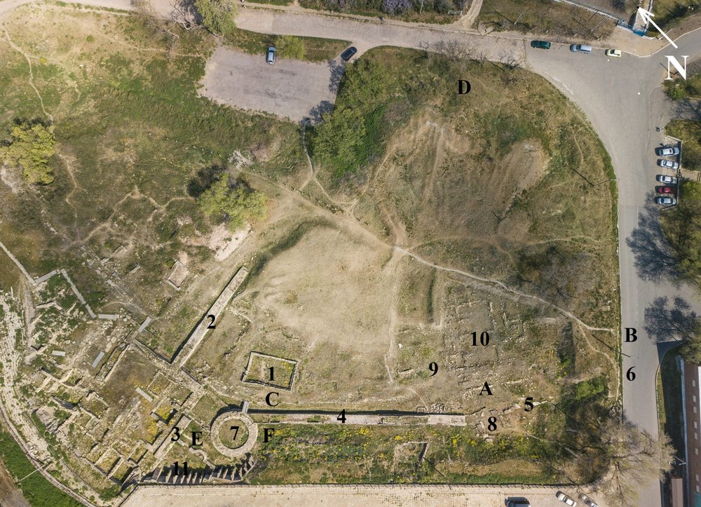 Roman citadel in Tyras. 1 – vexillation building; 2–5 – fragments of curtain walls; 6 – location of discovery of a fragment of the curtain wall; 7–8 – towers; 9 – construction 497; 10 – monumental building with a portico (structure 702); 11 – building with an apse (610); A – finding spot of the limestone votive altar and the aproximate finding spot of fragments of marble votive slabs with inscriptions; B – finding spot of the marble slab with a dedicatory inscription to Ascelpius and Hygieia from military doctors; C – approximate finding spot of a limestone pediment with inscription in honor of the emperor; D – finding spot of the marble relief depicting Artemis and the marble statuette of Priapus; E – approximate finding spot of the marble relief of Mithras; F – finding spot of the marble relief of the Thracian horseman. © O. Gimanov// UAH Admin