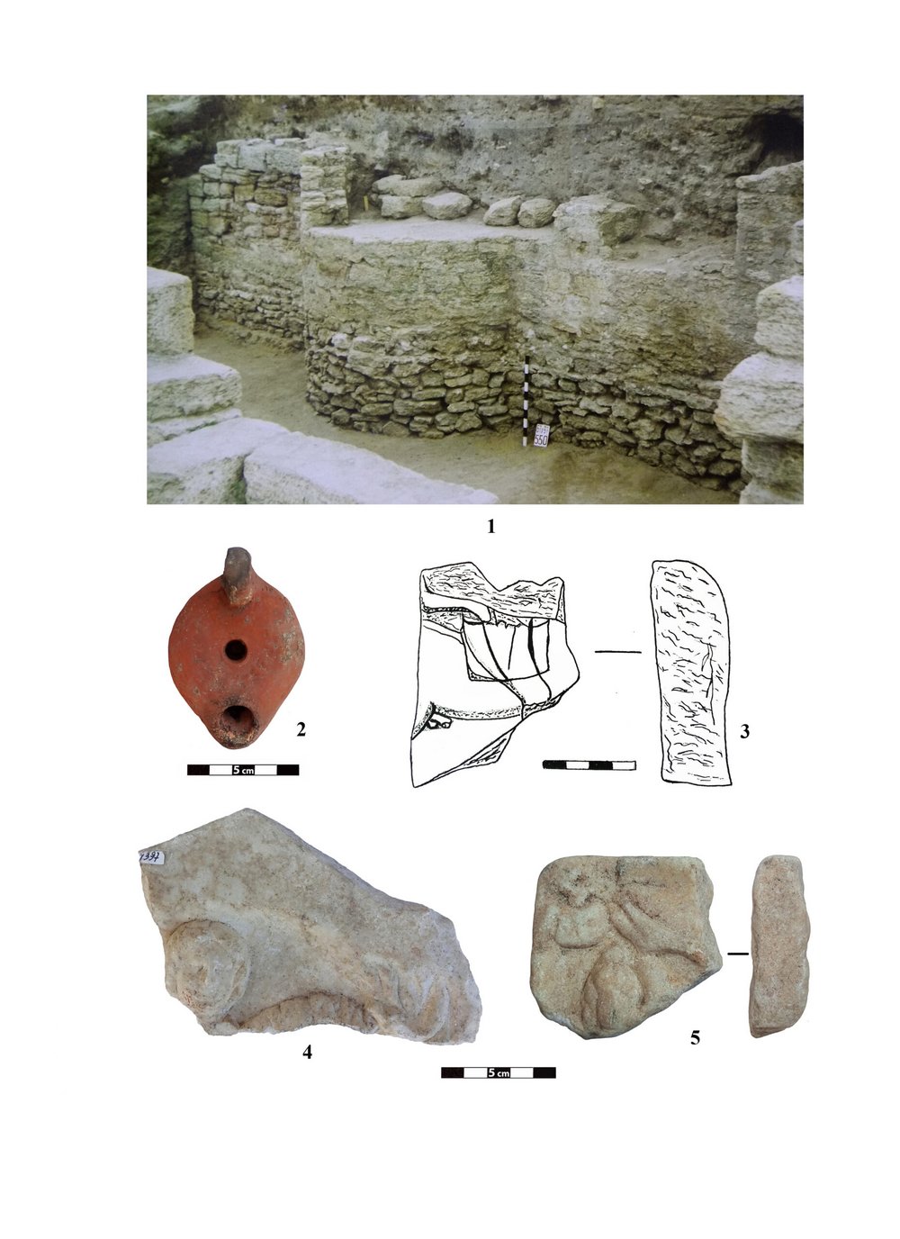 East wall of building 610, excavations in 1997 (after Rosokhatskiy 1997, Pl. 13,1); 2 – a lamp found on the floor of the apse (photo by K. Savelieva); 3 – fragment of the marble votive relief depicting a Thracian horseman (after Batizat/Rosokhatskiy 2005, Fig. 3); 4 – fragment of the marble votive relief depicting a Thracian horseman. 5 – fragment of the marble votive relief with a tauroctony scene (photo by K. Savelieva). © K. Savelieva// UAH Admin