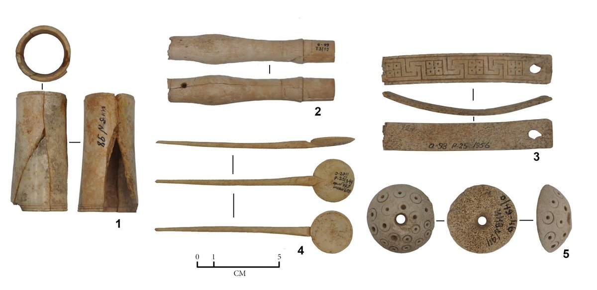 Some bone artifacts from the museum: 1 – pyxis; 2 – fragment of aulos, a musical instrument; 3 – antler plate; 4 – spoon; 5 – processed epiphysis © Alisa Semenova// UAH Admin