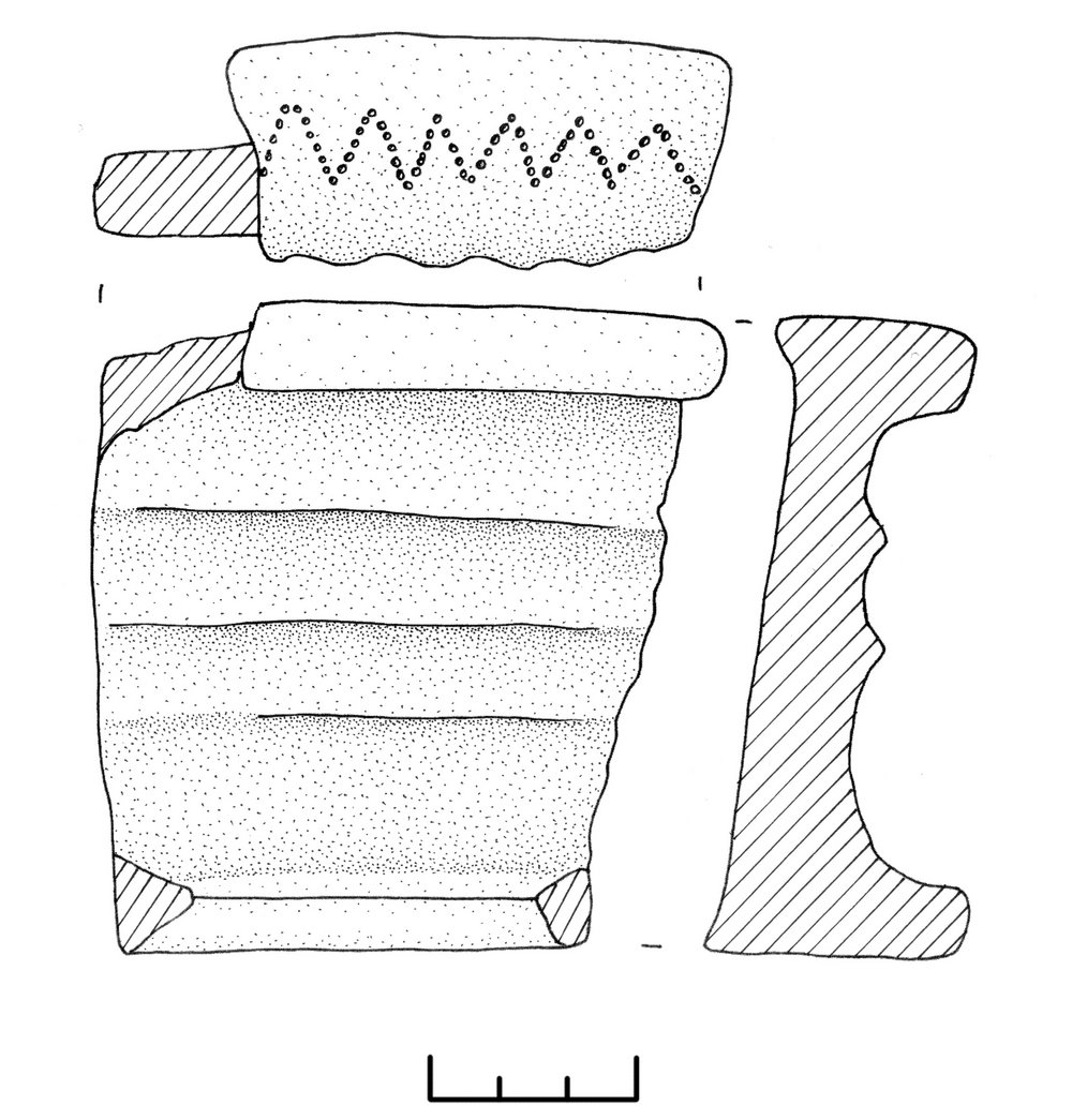Until now, over 50 similar ceramic frames of the stove mouth have been identified in museum collections. Most of them are fragments, but among the collected material there are edge parts, which have been divided into two varieties: with a flat finish (Fig. 2), which was located at the base of the stove, and central parts with a figured edge cut (Fig. 3). These cutouts served to connect several arches (usually 3–4) to create a single arched structure that strengthened the mouth of the stove. Such mouths had a semicircular or subtriangular shape and a height of 30–40 cm, which correlates with the height of typical pots of the 17th–18th centuries. Some of the products were decorated with simple ornaments such as floral stamps (Fig. 4), lines, waves, zigzag (Fig. 5), or simply holes (Fig. 1).