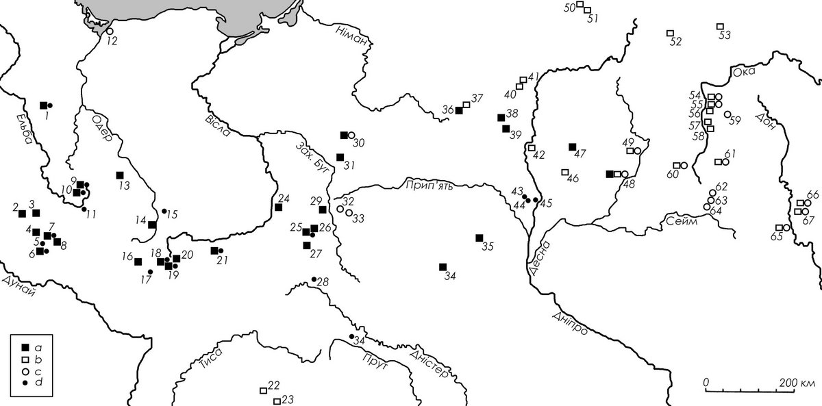 Distribution of wooden structures in Slavic barrows of the 8th–10th centuries: a – buildings of the Lipsko type and typologically similar quadrangular structures; b – quadrangular structures of other types; c – ring fences; d – pillar structures associated with burials © D. Bibikov// UAH Admin