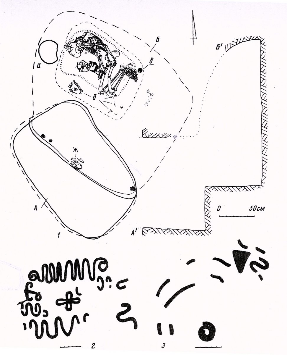 Stele-like feature (geoglyph) at the bottom of the catacomb from Biloyarivka Mound 5, Burial 10, Donetsk region. 1 – plan of the Burial 10 in Biloyarivka; 2–3 – ochre paintings at the bottom of the catacomb (after Sanzharov 1989). © Sanzharov // UAH Admin