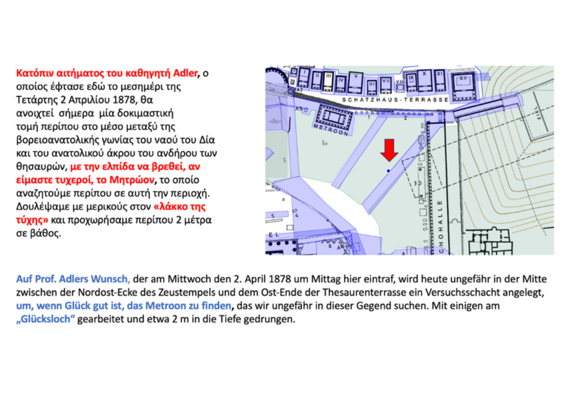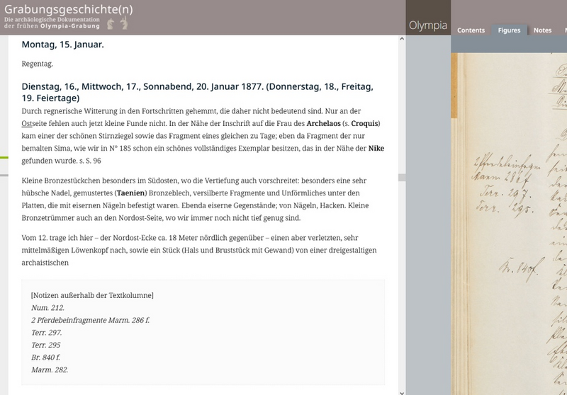 Die Transkriptionen der ersten Tagebücher aus den Grabungskampagnen von 1876 bis 1879 sind bereits online veröffentlicht. Sie liegen als maschinenlesbare Edition vor, die sich etwa mithilfe Künstlicher Intelligenz automatisch übersetzen lässt. Diese Tagebücher geben Einblick in die frühen Jahre der Grabung – in Methoden, Logistik und Arbeitsalltag zwischen Dauerregen und Hitzewellen. Sie berichten auch von offiziellen Besuchen aus Berlin, wo das „hohe Direktorium“ der Grabung – quasi der Aufsichtsrat – tagte. Manches Mitglied gab vor Ort sogar Anweisungen, wo gegraben werden sollte. So entstand etwa „Adlers Glücksloch“ – ein Grabungsschnitt, der auf der Suche nach dem bei Pausanias erwähnten Metroon angelegt wurde, dem jüngsten der drei großen Tempel Olympias. Das Glück blieb aus: Das Metroon wurde verfehlt. Und die genaue Lage dieses „Glückslochs“ lässt sich aus den Tagebucheinträgen nicht leicht rekonstruieren.
