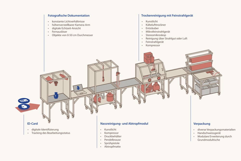 Dabei hilft ein Projekt, das ursprünglich einen ganz anderen Fokus hat: die KulturGutRetter. Gemeinsam mit dem Technischen Hilfswerk und dem Leibniz-Zentrum für Archäologie entwickelt das DAI – gefördert durch das Auswärtige Amt – eine „Cultural Heritage Response Unit“. Sie soll im EU-Katastrophenschutzmechanismus Kulturgüter im Notfall schnell dokumentieren und sichern können. Dafür wurde ein modulares, transportierbares Restaurierungslabor mit abgestimmten Workflows entwickelt.