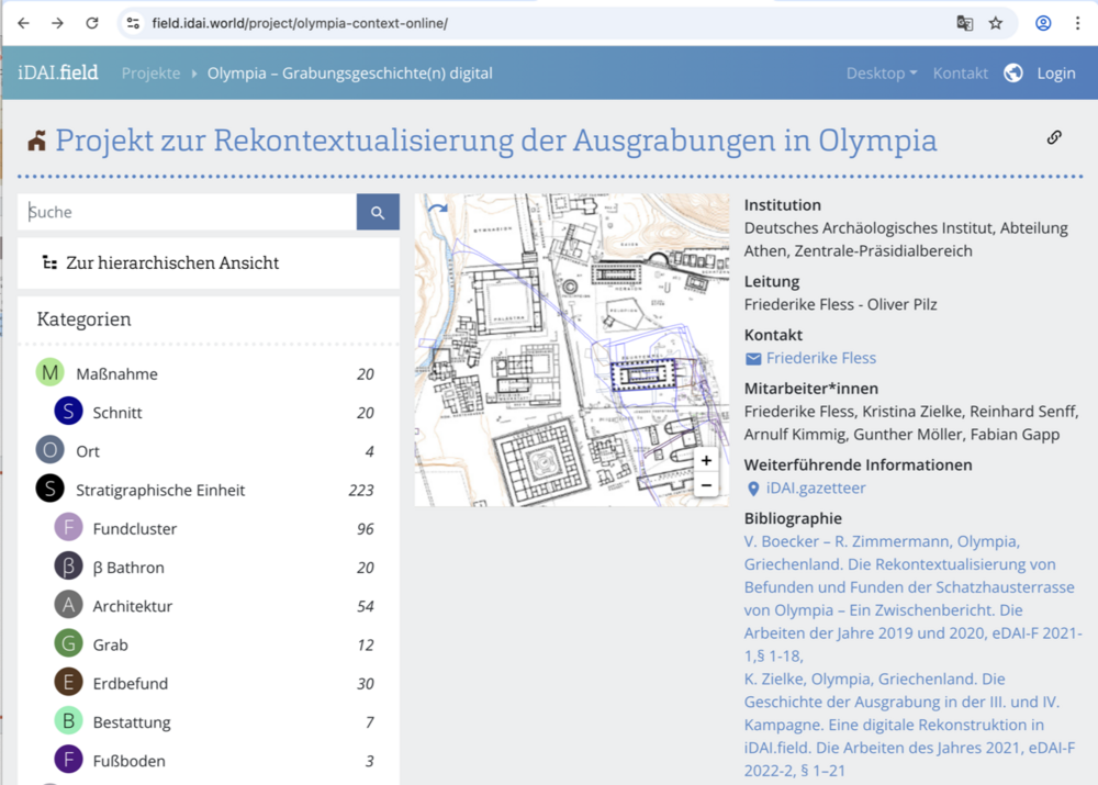 Aus dieser Herausforderung entstand die Idee für ein weiteres digitales Projekt: Olympia Context. Hier testet das DAI seine eigens entwickelte, frei verfügbare Software zur Dokumentation von Ausgrabungen, iDAI.field, für die Rekonstruktion historischer Grabungen. Die Ergebnisse der ersten Kampagne sind bereits online in einer Demo-Version zugänglich. Im kommenden Jahr soll die sechste Kampagne abgeschlossen werden. Damit wären dann alle Ausgrabungskampagnen zwischen 1875 und 1881 digital recherchierbar. iDAI.field kombiniert eine Bilddatenbank der Funde mit entsprechenden Kontextinformationen, die man gezielt über die graphische Oberfläche durchsuchen kann: Wann wurde wo gegraben? Was steht im Grabungstagebuch? Welche Fundkontexte und Funde sind dokumentiert? Gibt es Pläne, Zeichnungen und Fotografien? So können wir Grabungsgeschichte nachvollziehen – manchmal sogar taggenau.