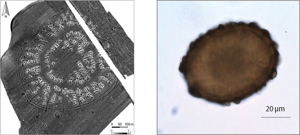 left: Results of the magnetometer survey: Stolniceni I; right: Microscopic image of a parasite, an ascaris egg, roundworm, found at the Neolithic lakeside settlement of La Drage in Spain (5320-4980 BC) © Dr. Céline Maicher // left image: S. Ţerna/A. Vornicu-Ţerna/R. Hofmann/M. Dal Corso/L. Shatilo/M. Vasilache-Curoşu/V. Rud/H. Knapp/W. Kirleis/K. Rassmann/J. Müller, Stolniceni – Excavation results from the 2017 campaign. JNA 21, 2019, 209–281; right image: Dr. Céline Maicher.