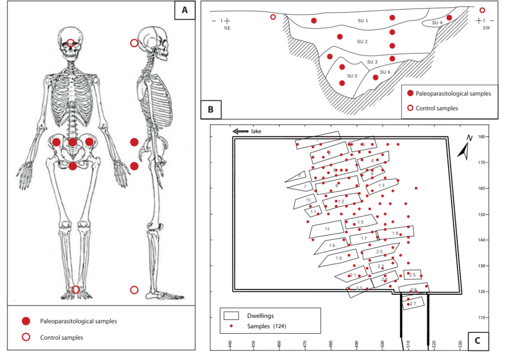 Various sampling strategies depending on the archaeological context: (A) sampling onskeletons; (B) sampling in structures as latrines or pits; (C) sampling in occupation layers (example of Zurich Parkhaus Opera, Switzerland) © Dr. Céline Maicher// image: Dr. Céline Maicher.