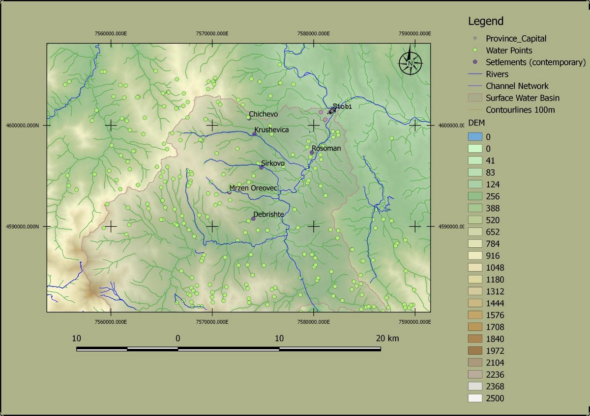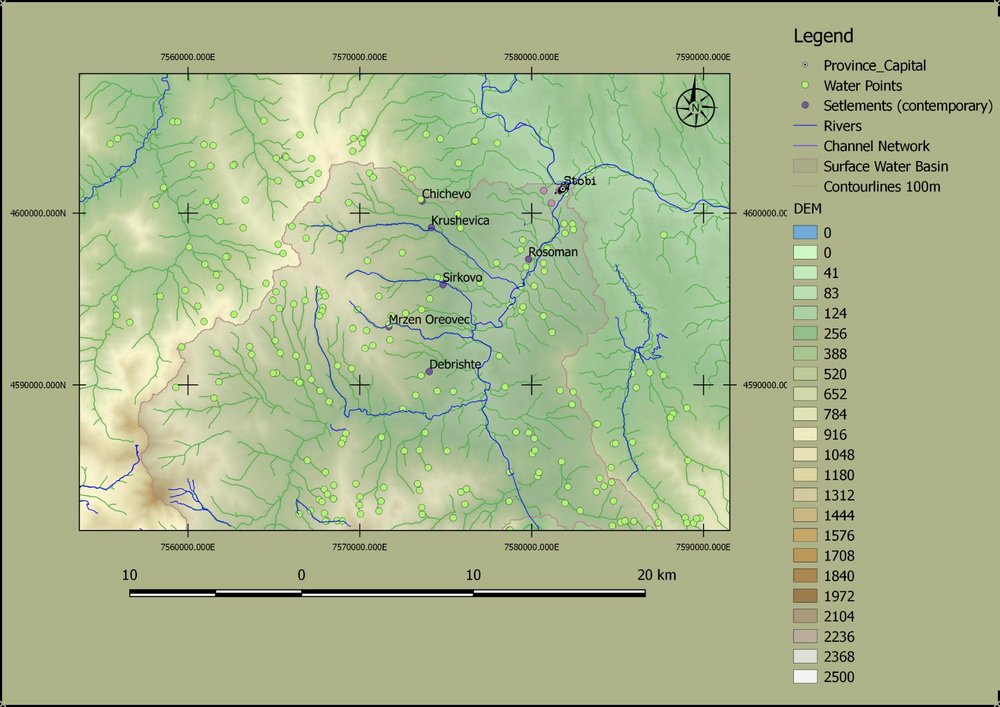 Hydrological analysis of the surface water runoff basin in the southwestern vicinity of Stobi (presented at Land Experience in Antiquity. Build. Redefine. Live University of Rome - Tor Vergara, Faculty of Literature and Philosophy. ROME, 15 - 17 May 2019) © Dr. Hristijan Talevski// image: Dr. Hristijan Talevski.