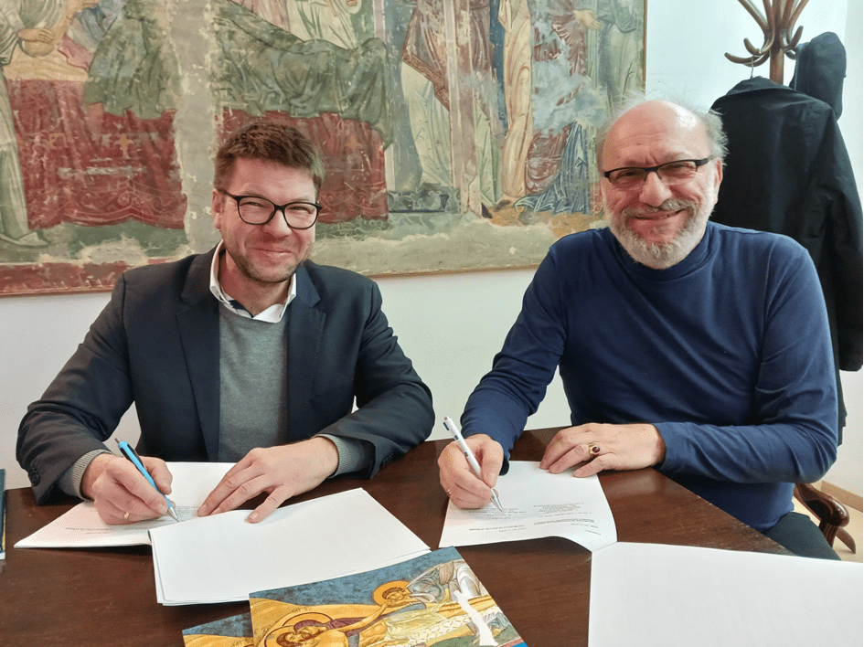 Dr. Panche Velkov (City Museum of Skopje) and PD Dr. Lukas Werther (DAI/RGK) signing a Memorandum of Understanding on November 26 2024 to facilitate joint research on Scupi and its hinterland © DAI + RGK // Photo: Alexander Gramsch (RGK).