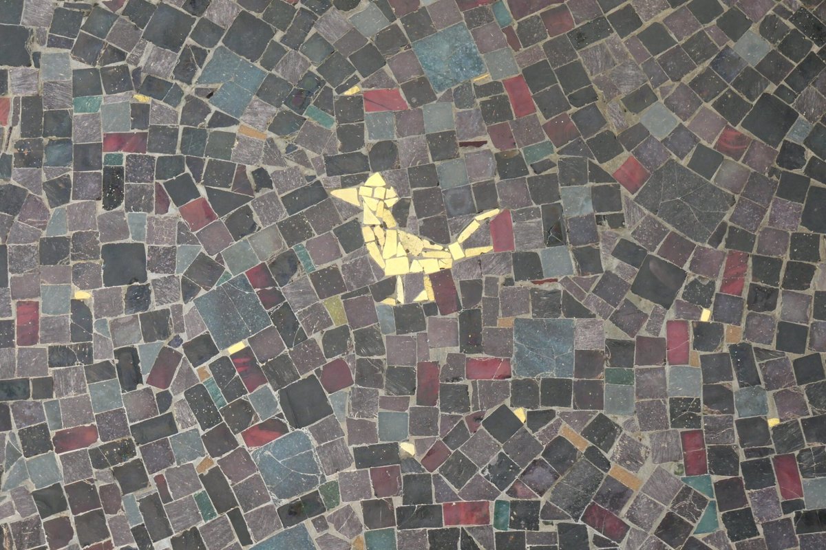 Vierzehn Tage vor der feierlichen Eröffnung des Neubaus Ende Oktober 1956 wurde das Mosaik durch eine Stuttgarter Firma für Bildhauerei und Stuck fertiggestellt. Seitdem werden die Besucherinnen und Besucher der RGK von einem Mosaik begrüßt, dass die Epochen und Gebiete repräsentiert, zu denen in der RGK bis heute geforscht wird. Auf der linken Seite ist der Adler einer spätantiken Adlerfibel aus dem italienischen Cesana groß ausgeführt. Darunter rahmt der Wortlaut DIVVS AVGVSTVS das Profil des Kaisers Augustus; eine von unzähligen Münzen dieses Herrschers diente dafür als Vorlage. Unten fährt schließlich eine sog. Sonnenbarke nach dem Vorbild zahlreicher bronzezeitlicher Felszeichnungen Skandinaviens und Rasiermesserverzierungen. Auf der rechten Seite ist der prächtige Aufsatz einer Signumlanze der beneficiarii consularis dargestellt, darunter rennt ein schlanker Hund. Sein Vorbild ziert als kleine vollplastische Figur die Henkel zweier eisenzeitlichen Schnabelkannen von Basse-Yutz, die als Glanzstücke der latènzeitlichen Kunst heute im Britischen Museum in London zu bewundern sind. Dem Hund folgt unten ein Hirsch, wie ihn ein Tierfries auf der Bronzekanne aus dem sog. Fürstengrab von Rodenbach zeigt. Über beide dunkle Mosaikflächen scheinen kleine goldene Blumen gestreut. Dabei handelt es sich wahrscheinlich um stilisierte frühmittelalterliche Scheibenfibeln, für die zahlreiche Beispiele überliefert sind.