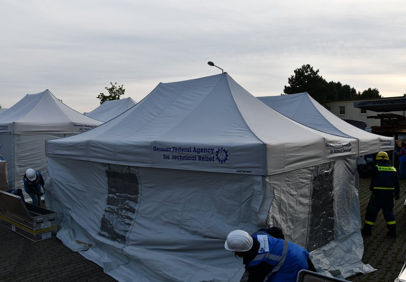Für die Notversorgung des geborgenen beweglichen Kulturguts errichteten Fachleute für Konservierung/Restaurierung, Archäologie und Katastrophenhilfe auf dem Gelände des THW Ortsverbands Dresden sieben Rettungszelte, in denen ein mobiles modulares Rettungslabor aufgebaut wurde, das Expertinnen und Experten am LEIZA im Rahmen des KulturGutRetter-Projektes entwickelt haben. Bereits während des Aufbaus wurden Aufbauanleitungen der modularen Labortische von den Teilnehmenden evaluiert, um die Montage der Geräte und Labormöbel zukünftig noch intuitiver und verständlicher zu machen. Konzepte für Infrastruktur, Logistik, Führung und Koordinierung etablierten vorab Fachkräfte des THW im Rahmen des Projektes.