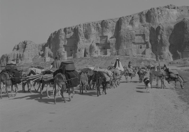 Nomadenzug der Qaschgahu, im Hintergrund die Felsgräber der achaeminidischen Könige von Naqsh-e Rostam, Schiraz, Provinz Fars, Iran. Foto entstanden zw. 1972-1978. © DAI Teheran // Barbara Grunewald
