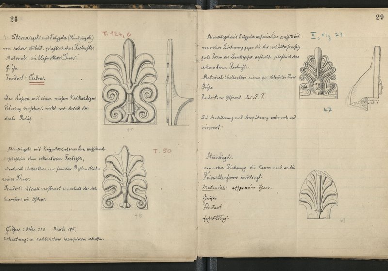 Doppelseite aus "Zusammenstellung und Verzeichnis der architektonischen Terrakotten von Olympia" von Richard Borrmann © DAI Athen // Richard Borrmann
