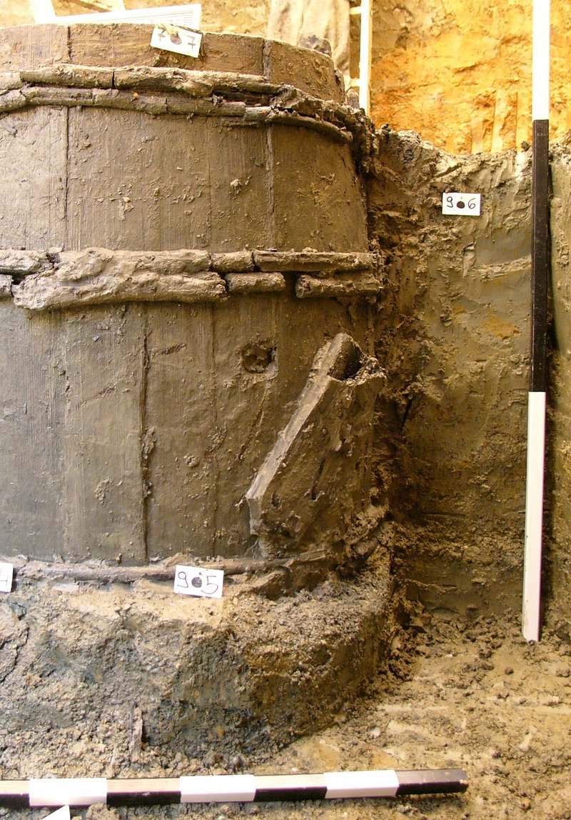 2009 wurde ein römischer Brunnen untersucht, der schon im Jahr zuvor erkannt worden war. Ab sechs Metern tiefe, dem heutigen Grundwasserpegel, waren alle Bauhölzer sehr gut erhalten. Zur großen Überraschung befanden sich zahlreiche Holzobjekte im Brunnenschacht. Ganz unten im Schacht stand ein großes Fass, das ursprünglich ein Fassungsvermögen von über 1000 l Wein bessen hatte. Auf der Innenseite der Fassdauben hat sich rund 2000 Jahre alter Weinstein erhalten. Auch Brandstempel der römischen Küfer oder Holzlieferanten sind auf den Dauben zu lesen. Durch die Hölzer im Schacht war der Brunnen als Wasserquelle unbrauchbar gemacht worden. Es fanden sich Architektur- und Wagenteile, Holzeimer und Griffe von Geräten aber auch Leiterteile, ein Holzhammer, ein Wurfholz und vieles mehr. Alles war zerbrochen und nicht vollständig in den Brunnen geworfen worden.