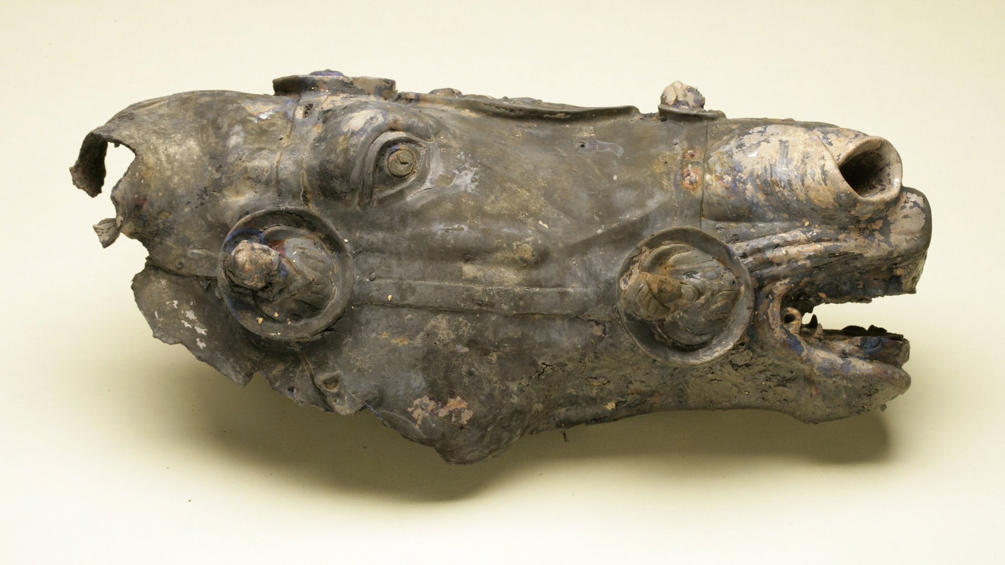 Beim Entfernen der Fassdauben war die Überraschung groß, denn am Boden des Fasses lag ein lebensgroßer Pferdekopf aus vergoldeter Bronze mit reich geschmückter Schirrung. An einigen Stellen sind deutlich die Spuren von Schlägen und Einhieben zu erkennen, die zur Zerstörung der Statue führten. Seitlich ist das Kopfgeschirr mit Medaillons mit Büsten der Siegesgöttin Victoria geschmückt, das ovale Medaillon auf dem Nasenrücken zeigt das Bild des auf einem Felsen ruhenden Kriegsgottes Mars. Der Pferdekopf ist ein außerordentlicher Fund spätaugusteischer Großplastik, der außerdem noch exzellent zu datieren ist.