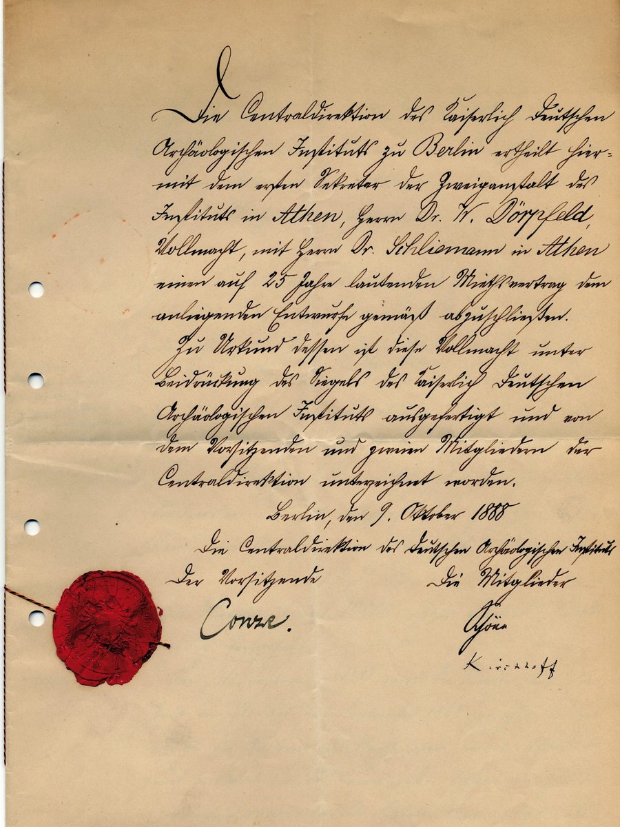 Fig. 2: The Executive Committee of the DAI approves the conclusion of a twenty-five-year rental contract with Schliemann. © Archiv DAI Athen, Institutsgeschichte// N.N.
