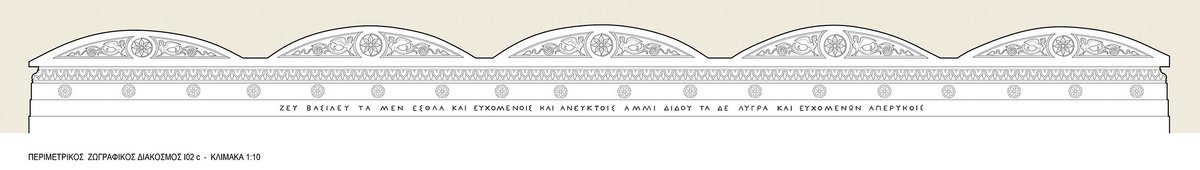 Fig. 5: Motto over the entrance to the library, southwest wall, ground floor of the DAI Athens: Ζεῦ βασιλεῦ, τὰ μὲν ἐσθλὰ καὶ εὐχομένοις καὶ ἀνεύκτοις | ἄμμι δίδου, τὰ δὲ λυγρὰ καὶ εὐχομένων ἀπερύκοις. (King Zeus, give us the good for which we pray and pray not; but keep from us the sorrowful, even if we should pray for it. [Translation by J. N. Dillon]) Anonymous, Anthologia Palatina 10.108. © DAI Athens// Imantosis