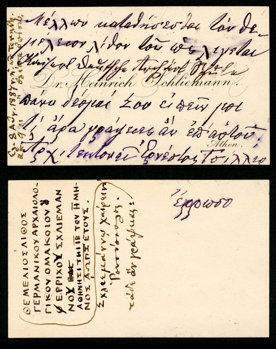 Schliemann personally oversaw numerous details of the construction. For example, being a polyglot, Schliemann meticulously selected the Greek quotations that adorn the Institute today. Moreover, the archive of the DAI Athens still holds a calling card of Schliemann’s, on which he asked the eminent Greek philologist Athanasios Roussopoulos what he should inscribe on the foundation stone of the building. The latter replied on the same card, on August 12, 1887 (fig. 4):