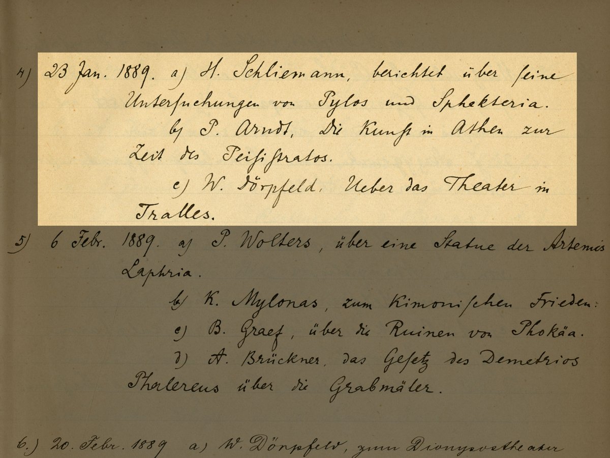 Fig. 1: Entry in the minutes of a meeting at the DAI Athens in the newly built Institute on January 23, 1889, which featured a talk by Schliemann. © Archiv DAI Athen, Institutsgeschichte// N.N.