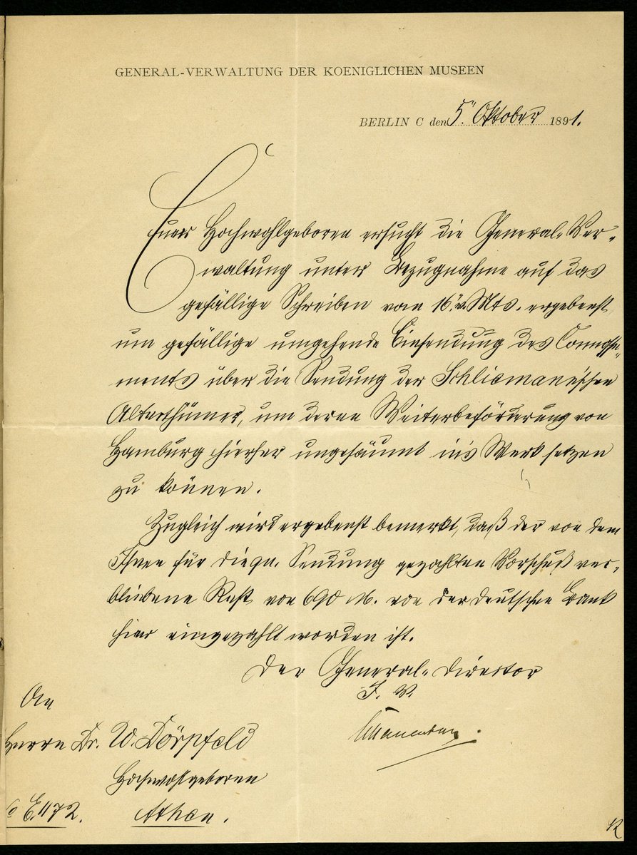 Fig. 6: The Director General of the Staatliche Museen zu Berlin corresponds with Wilhelm Dörpfeld about shipping “Schliemann’sche” antiquities to Berlin. © Archiv DAI Athen, Materialsammlung zu Schliemann// N.N.